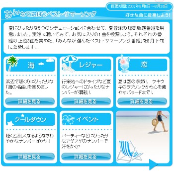 共有五種類型的歌曲可以投票,海、レジャー(閒暇娛樂)、恋、